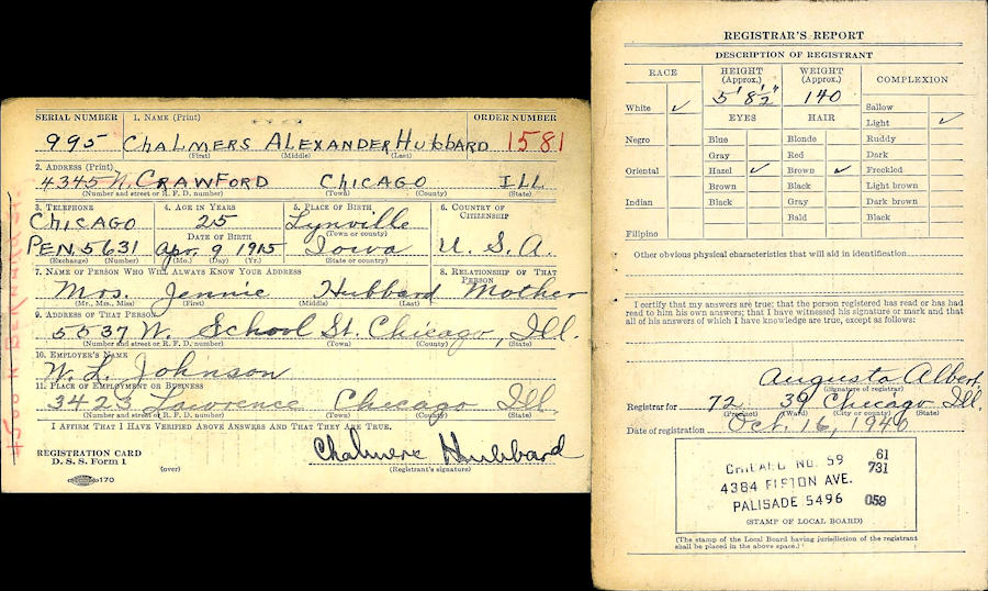 Birth Born on April 09, 1915 in Lynnville, Jasper Co., IA Death Died on August 22, 1981 in Chicago, Cook Co., IL Buried in Memory Gardens Cemetery in Arlington Heights, Cook Co., IL Marriages PATTERSON, Ruby Mayoria Married on June 29, 1940 in Chicago, Cook Co., IL Children HUBBARD, Sharon Louise: July 01, 1941 HUBBARD, Craig S.: April 25, 1947 Notes Occupation: Collector Newspaper/ Welder Radio & Television Parts Manufacturer Sources Illinois Deaths: Cook Co. #617728 Images Chalmers Hubbard WW@ Draft