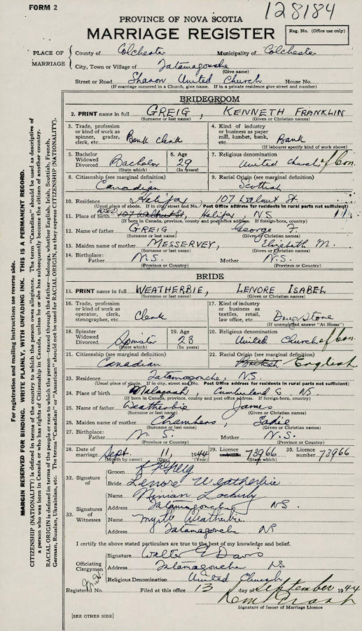 Birth Born on August 15, 1915 in Halifax, Halifax Regional Municipality, NS Death Died on March 31, 1966 in Halifax, Halifax Regional Municipality, NS Buried in Dartmouth Memorial Gardens in Dartmouth, Halifax Co., NS Marriages WEATHERBIE, Lenore Isabelle Married on September 11, 1944 in Tatamagouche, Colchester Co., NS Notes Death: Cardiac Arrest/ Metastatic Bone Cancer Occupation: Bank Clerk/ Bank Manager Sources Nova Scotia Deaths: Y3ar 1966 #2500 Images Kenneth Greig Birth Kenneth Greig Death Lenore Weatherbie Marriage