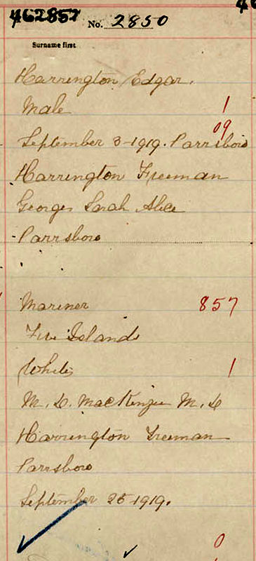 Parents Father: HARRINGTON, Freeman Mother: COUCH, Sarah Alice Birth Born on September 08, 1919 in Parrsboro, Cumberland Co., NS Death Died on October 22, 1940 in At Sea Buried in Halifax Memorial in Halifax, Halifax Regional Municipality, NS Notes Military Service: WW2 R C Navy Stoker Sources Findagrave.com: https://www.findagrave.com/cgi-bin/fg.cgi?page=gr&GRid=56171758 Images Edgar Harrington Birth
