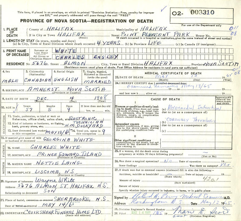 Birth Born on December 04, 1908 in Amherst, Cumberland Co., NS Death Died on May 13, 1965 in Halifax, Halifax Regional Municipality, NS Buried in Sherbrooke, Guysborough Co., NS Marriages WEATHERBIE, Hazel Dawn Married on September 07, 1938 in Tatamagouche, Colchester Co., NS Notes Occupation: Miner/ Electrician - Electronic Technician Halifax Dockyard Death: Myocardial Infarction/ Coronary Thrombosis Sources Nova Scotia Deaths: Year 1965 #3310 Images Charles White Death Hazel Weatherbie Marriage