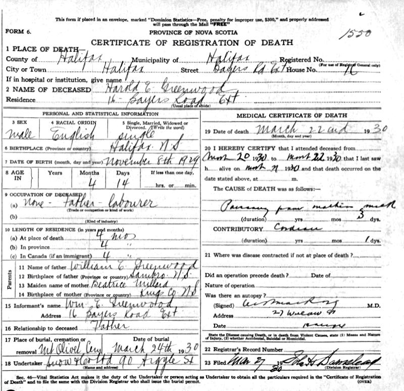 Parents Father: GREENWOOD, William Everett Mother: MILLARD, Beatrice Emmaline Birth Born on November 08, 1929 in Halifax, Halifax Regional Municipality, NS Death Died on March 22, 1930 in Halifax, Halifax Regional Municipality, NS Buried in Mount Olivet Cemetery in Halifax, Halifax Regional Municipality, NS Notes Death: Poisoning Sources Nova Scotia Deaths: Year 1930 File 134 #1550 Images Harold Greenwood Death