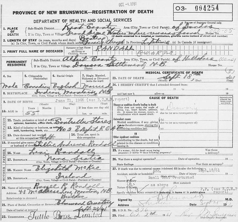 Birth Born on June 22, 1906 in Indian Mountain, Westmorland Co., NB Death Died on September 18, 1961 in Grande-Digue, Kent Co., NB Buried in Elmwood Cemetery in Moncton, Westmorland Co., NB Marriages ANDREWS, Matilda Mary Married on January 03, 1928 in Moncton, Westmorland Co., NB Children RANDALL, Claudia J.: 1934 - 1934 Notes Occupation: Meat Cutter/ Stores Controller RCAF Death: Drowning Sources NB Deaths: #4254 Images George Randall Birth George & Matilda (Andrews) Randall George Randall Death Matilda Andrews Marriage