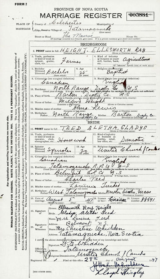 Parents Father: TEED, Charles Stephen Mother: TUCKER, Lavinia May Birth Born on 1927 in Belmont, Colchester Co., NS Death Died on October 06, 1992 in Truro, Colchester Co., NS Buried in Belmont Cemetery in Belmont, Colchester Co., NS Marriages HEIGHT, Ellesworth Ray Married on August 05, 1947 in Tatamagouche, Colchester Co., NS Sources Mormons: https://www.familysearch.org/tree/person/details/LB5Z-16V Images Ellsworth & Gladys (Teed) Height Gladys Teed Marriage