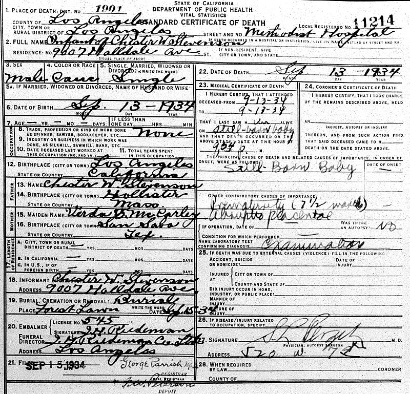 Parents Father: STEVENSON, Chester William Mother: McCARLEY, Verda Valree Birth Born on September 13, 1934 in Los Angeles, Los Angeles Co., CA Death Died on September 13, 1934 in Los Angeles, Los Angeles Co., CA Buried in Forest Lawn Memorial Park in Glendale, Los Angeles Co., CA Notes Death: Stillborn Sources California Births: Los Angeles #11214 Images Boy Stevenson Birth