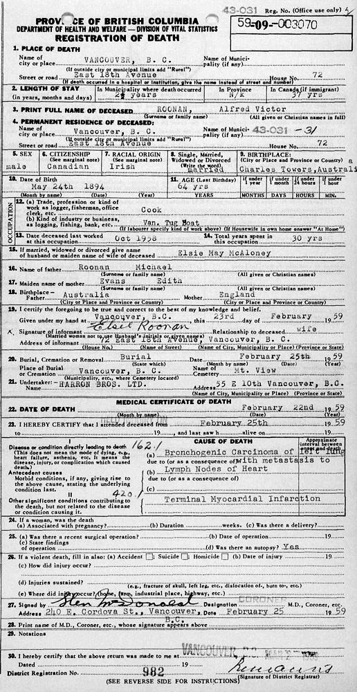 Birth Born on May 24, 1894 in Charters Towers, Queensland, Australia Death Died on February 22, 1959 in Vancouver, Metro Vancouver Region, BC Buried in Mountain View Cemetery in Vancouver, Metro Vancouver Region, BC Marriages McALONEY, Elsie May Notes Occupation: Cook Death: Bronchogenic Carcinoma of Left Lung/ Myocardial Infarction Military Service: WW1 Royal Australian Army Sources BC Deaths: 59-09-003070 Images Alfred Roonan Alfred Roonan Death Alfred Roonan