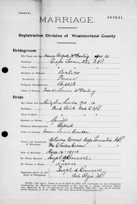 Birth Born on 1896 in Wood Point, Westmorland Co., NB Death Died on 1975 in Westmorland Co., NB Buried in Fernwood Cemetery in Port Elgin, Westmorland Co., NB Marriages McGLASHING, Harvey Bedford Married on December 16, 1914 in Port Elgin, Westmorland Co., NB Children McGLASHING, Isaac Franklin: September 19, 1915 - July 15, 2000 McGLASHING, Roy Louis: November 30, 1923 - October 26, 2008 Sources NB Cemeteries: Fernwood Cemetery Port Elgin,NB Images Harvey & Emily (Snowdon) McGlashing Harvey McGlashing Marriage