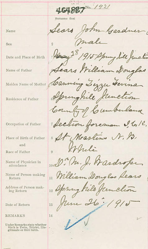 Birth Born on May 28, 1915 in Springhill Junction, Cumberland Co., NS Death Buried in Watson Cemetery in Salmon River, Colchester Co., NS Marriages DOUGLAS, Jennie Irene Married on October 23, 1941 in Truro, Colchester Co., NS Notes Occupation: Locomotive Fireman CNR Images John Douglas Birth John & Jennie (Douglas) Sears Jennie Douglas Marriage