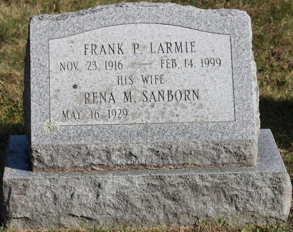 Birth Born on November 23, 1916 in Stockbridge, Windsor Co., VT Death Died on February 07, 1999 in Newport, Sullivan Co., NH Buried in Pine Grove Cemetery in Newport, Sullivan Co., NH Marriages WILSON, Edna Ruth Married on January 15, 1956 in Lisbon, Grafton Co., NH Children LARMIE, Frank Peter: August 22, 1956 Notes Occupation: Assistant Chief Clerk Kimels Shoe Corp./ Hotel Desk Clerk Military Service: WW2 US Army Images Frank Larmie Birth Frank Larmie Frank Larmie WW2 Draft Edna (Wilson) Northrop Marriage