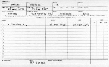 Parents Father: PARSONS, William J. Mother: PHINNEY, Theresa Evelyn Birth Born on August 28, 1897 in Parrsboro, Cumberland Co., NS Death Died on August 25, 1947 in Massachusetts, USA Buried in Achorn Cemetery in Rockland, Knox Co., ME Marriages BONZEY, Charles Merrill Married on July 09, 1917 in Boston, Suffolk Co., MA Children BONZEY, Charles Merrill: October 07, 1918 - January 11, 2001 Notes Occupation: Saleswoman Sources Maine Cemeteries: Achorn Cemetery Rockland,ME Plot: Ave. 2, Lot 86 Maine Cemeteries: Achorn Cemetery Records Rockland,ME Images Charles & Theresa (Parsons) Bonzey Cemetery Records Theresa Phinney Marriage Claude Parsons Marriage
