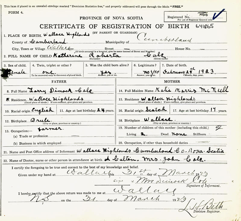Parents Father: COLE, Dimock Torry Mother: McNEIL, Katherine Morris Birth Born on February 28, 1923 in Wallace Highlands, Cumberland Co., NS Death Died on August 14, 1953 in Tatamagouche, Colchester Co., NS Buried in Monument Hill Cemetery in Wallace Grant, Cumberland Co., NS Notes Occupation: Registered Nurse Death: Carcinoma of Breast Sources Nova Scotia Deaths: Year 1953 #4568 Images Katherine Cole Birth Dimock & Catherine (McNeil) Cole,Katherine & Lula Cole Katherine Cole Death