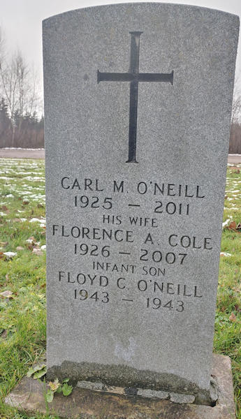Birth Born on 1925 in Truro, Colchester Co., NS Death Died on 2011 Buried in Sunny Brae Cemetery in Oliver, Colchester Co., NS Marriages COLE, Florence Annetta Married on June 09, 1943 in Tatamagouche, Colchester Co., NS Children O'NEIL, Floyd Carman: August 15, 1943 - November 19, 1943 Notes Occupation: Rural Mail Carrier Sources Colchester Cemeteries: Sunny Brae Cemetery Oliver,NS Images Carl & Florence (Cole) & Floyd O'Neil Florence Cole Marriage