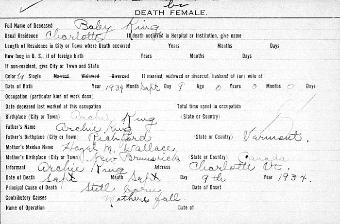 Parents Father: KING, Archie Lawrence Mother: WALLACE, Hazel Margaret Birth Born on September 09, 1934 in Charlotte, Chittenden Co., VT Death Died on September 09, 1934 in Charlotte, Chittenden Co., VT Notes Death: Stillborn Images Girl King Birth Girl King Death