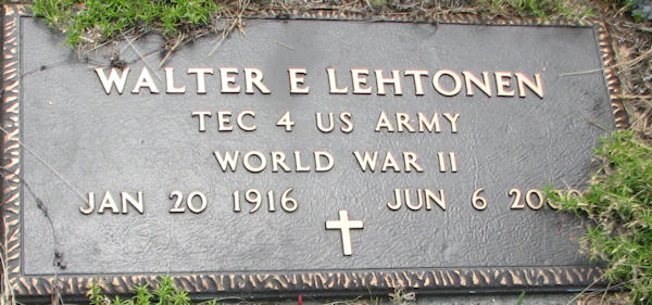 Birth Born on January 20, 1915 in New Ipswich, Hillsborough Co., NH Death Died on June 06, 2000 in Bristol, Hartford Co., CT Buried in Smithville Cemetery in New Ipswich Center, NH Marriages WALLACE, Hazel Margaret Married on July 19, 1971 in Bristol, Hartford Co., CT Notes Occupation: Employee at Granite State Tannery Co/ Farm Labourer/.Caretaker Military Service: WW2 US Army Sources Connecticut Deaths: #11856 Images Walter Lehtonen Walter Lehtonen WW2 Draft