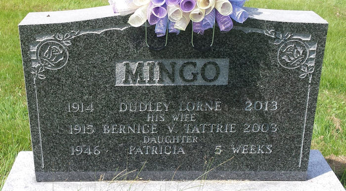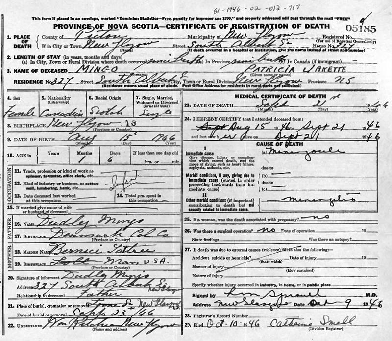 Parents Father: MINGO, Dudley Lorne Mother: TATTRIE, Bernice Vivian Birth Born on August 15, 1946 in New Glasgow, Pictou Co., NS Death Died on September 21, 1946 in New Glasgow, Pictou Co., NS Buried in Lockerby Memorial Cemetery in Tatamagouche, Colchester Co., NS Notes Death: Meningocele/ Meningitis Sources Nova Scotia Deaths: Year 1946 #5185 Images Dudley & Bernice (Tattrie) & Patricia Mingo Patricia Mingo Death