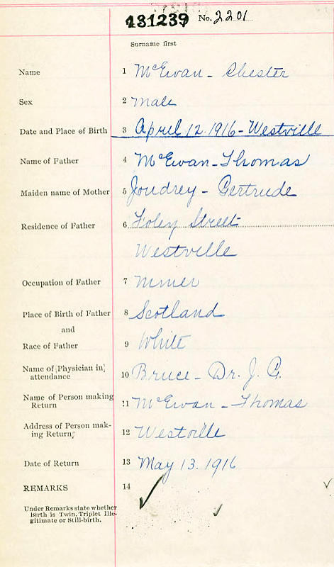Parents Father: MACEWAN, Thomas A. Mother: JOUDRIE, Gertrude Birth Born on April 12, 1916 in Westville, Pictou Co., NS Death Died on 1998 in New Glasgow, Pictou Co., NS Marriages MACALLISTER, Anne Cameron Married on October 18, 1937 in New Glasgow, Pictou Co., NS Children MACEWAN, Chester Cameron: May 15, 1938 - October 01, 1996 MACEWAN, Lenora Irene: April 19, 1939 - June 12, 1940 MACEWAN, Shawn: 1961 - 1997 Sources Mormons: https://www.familysearch.org/en/tree/person/details/GTWC-5FM Images Chester MacEwan Birth Chester MacEwan Marriage