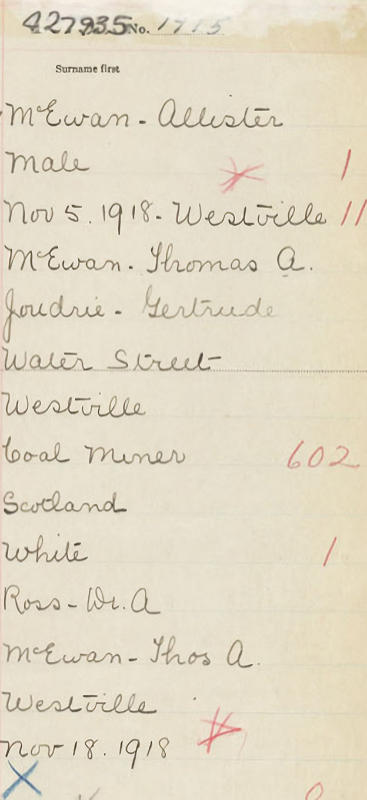 Parents Father: MACEWAN, Thomas A. Mother: JOUDRIE, Gertrude Birth Born on November 05, 1918 in Westville, Pictou Co., NS Images Allister MacEwan Birth