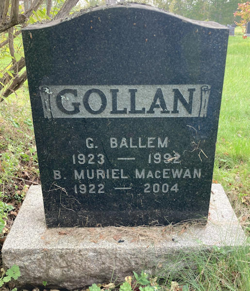 Parents Father: MACEWAN, Thomas A. Mother: JOUDRIE, Gertrude Birth Born on April 08, 1922 in Westville, Pictou Co., NS Death Died on December 16, 2004 in Pictou, Pictou Co., NS Buried in Haliburton Cemetery in Haliburton, Pictou Co., NS Marriages GOLLAN, George Ballem Married on November 10, 1944 in Pictou, Pictou Co., NS Notes Occupation: Office Clerk T. Eaton Co. Sources Mormons: https://www.familysearch.org/en/tree/person/details/GTWC-RS4 Images Barbara MacEwan Birth George & Barbara (MacEwan) Gollan Barbara MacEwan Marriage