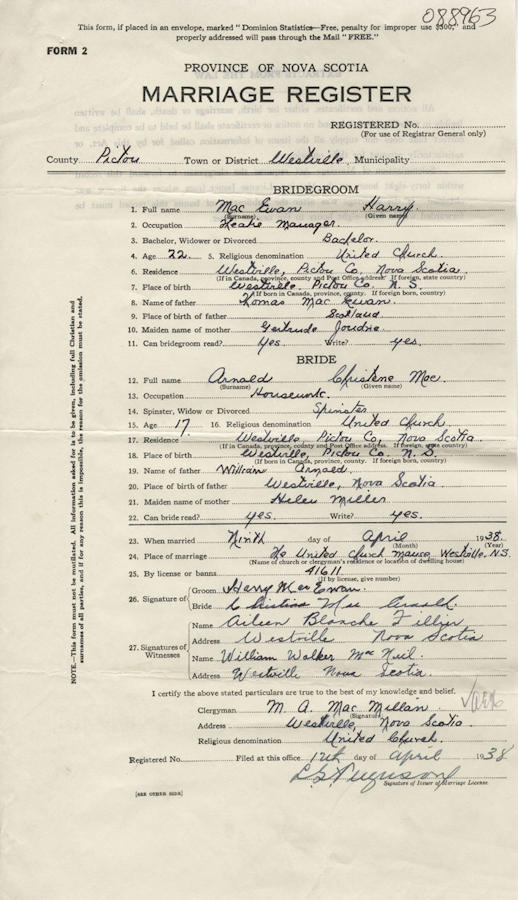 Birth Born on April 02, 1921 in Westville, Pictou Co., NS Death Died on 1998 in Pictou Co., NS Buried in St. Bee's Cemetery Westville,NS in Westville, Pictou Co., NS Marriages MACEWAN, Harry Married on April 09, 1938 in Westville, Pictou Co., NS Children MACEWAN, John Robert: 1941 - 1963 Sources Pictou Cemetery Records: St. Bee's Cemetery Westville,NS Images Christine Arnold Birth Harry & Christine (Arnold) & John MacEwan Harry MacEwan Marriage