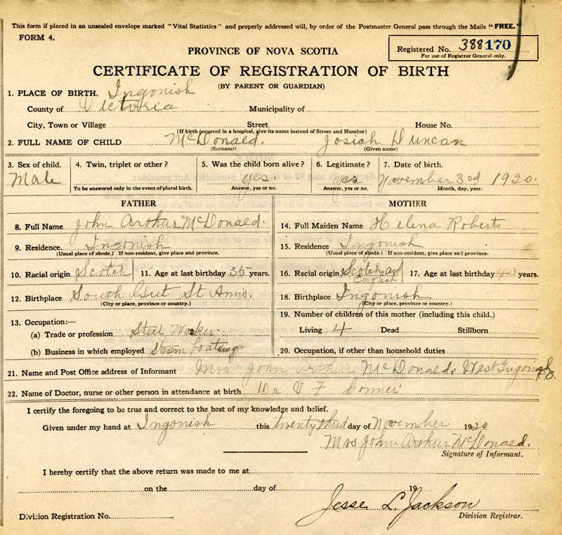 Birth Born on November 03, 1920 in Ingonish, Victoria Co., NS Marriages MACEWAN, Jean Crane Married on August 11, 1942 in Sydney, Cape Breton Co., NS Notes Military Service: WW2 RCAF Airman Images Josiah MacDonald Birth Jean MacEwan Marriage