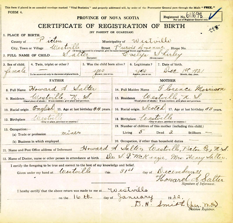 Birth Born on December 01, 1921 in Westville, Pictou Co., NS Death Died on October 12, 2018 in Riverton, Pictou Co., NS Buried in Auburn Cemetery in Westville, Pictou Co., NS Marriages MACEWAN, Percy Married on December 27, 1941 in Westville, Pictou Co., NS Children MACEWAN, Trudy MACEWAN, Percy: October 07, 1946 - December 12, 2007 Notes Obituary: E. Shirley MacEwan, 96 of Westville passed on Friday, October 12, 2018 in Valley View Villa. Born in Westville, she was a daughter of the late Howard and Florence (Morrison)) Salter. A lifelong resident of Westville, Shirley was a member of the Eastern Star Lodge for over 60 years holding many offices. In her earlier years, she was active in St. Andrews Presbyterian Church, the Westville Heritage Club and the Westville Curling Club. She will be dearly missed by her daughter Trudy Taylor (Fred); very special niece Katherine Saunders; 3 grand children and 5 great grand children. Shirley was predeceased by her husband Percy; son Percy "Spike" MacEwan; sister Ivy Stewart and brothers Bruce, John, Max, and Fernie Salter. Thank you to the Staff of Valley View Villa or the care given to Shirley. A grave side service was held 1:30pm Tuesday, October 16 at the Auburn Cemetery, Westville, with Rev. Greg Dickson officiating. Donations in her memory may be made to Valley View Villa or a charity of one's choice. Sources Funeral Home: Eagles Funeral Home Westville,NS Obituary October 2018 Images Shirley Salter Birth Percy & Evelyn(Salter) MacEwan & Percy & Jane (MacKean) MacEwan Percy MacEwan Marriage Evelyn Salter