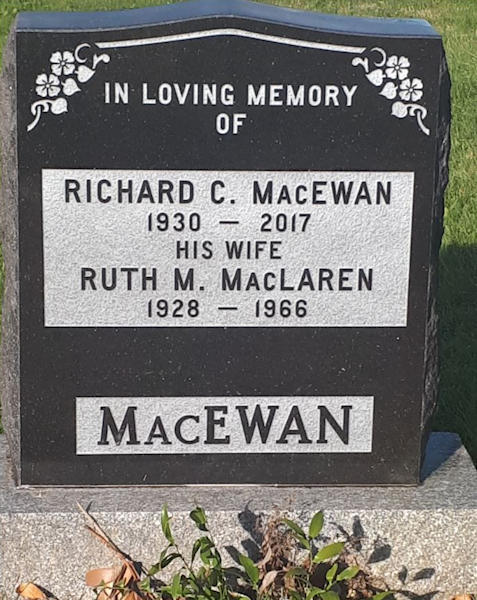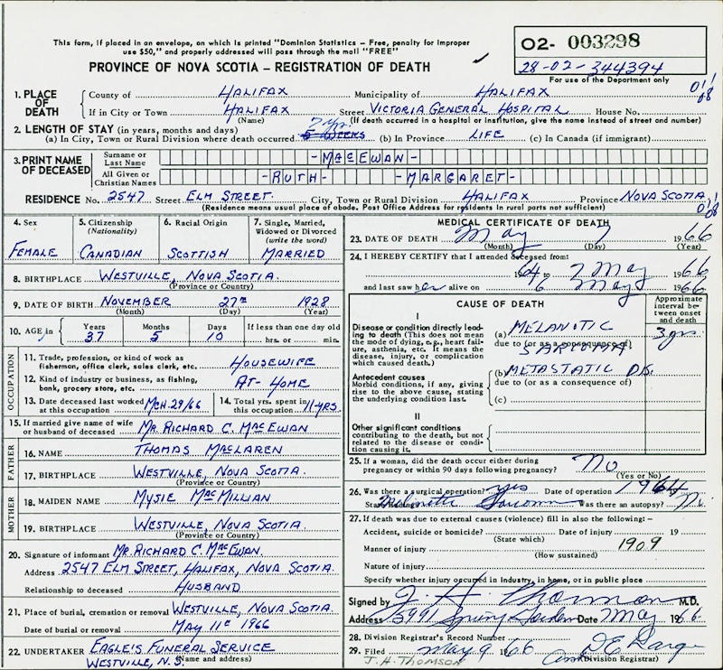 Birth Born on November 27, 1928 in Westville, Pictou Co., NS Death Died on May 07, 1966 in Halifax, Halifax Regional Municipality, NS Buried in Auburn Cemetery in Westville, Pictou Co., NS Marriages MACEWAN, Richard Carlyle Children MACEWAN, Lori MACEWAN, Sharon Notes Death: Melanotic Sarcoma Sources Nova Scotia Deaths: Year 1966 #3298 Images Richard & Ruth ( MacLaren) MacEwan Ruth (MacLaren) MacEwan Death