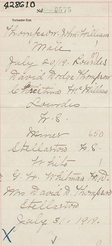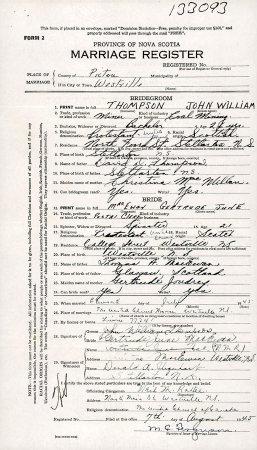 Birth Born on July 20, 1919 in Lourdes, Pictou Co., NS Marriages MACEWAN, Gertrude June Married on July 11, 1945 in Westville, Pictou Co., NS Children THOMPSON, Susan THOMPSON, Christopher Notes Occupation: Coal Miner Images John W. Thompson Birth Gertrude MacEwan Marriage