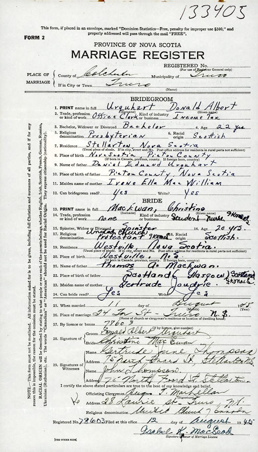 Birth Born on October 07, 1922 in Plymouth, Pictou Co., NS Marriages MACEWAN, Christina Married on August 11, 1945 in Truro, Colchester Co., NS Notes Occupation: Office Clerk Images Donald Urquhart Birth Christin e MacEwan Marriage