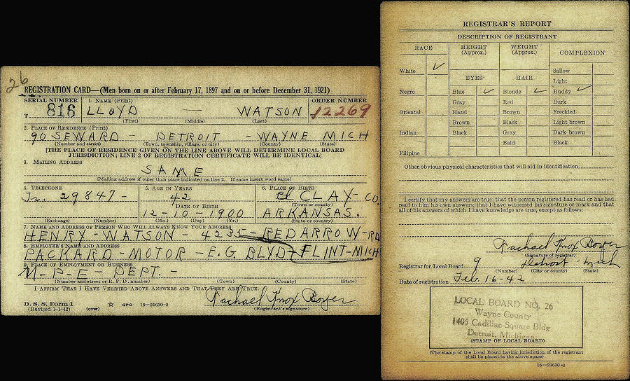 Birth Born on December 10, 1900 in Bradshaw Township, Clay Co., AR Marriages JOLLYMORE, Harriet Kathleen Married on June 28, 1941 in Napoleon, Henry Co., OH Divorced in 1943 Notes Occupation: Paint Mechanic/ Employee at Packard Motor Co. Images Lloyd Watson WW2 Draft Harriet Jollymore Marriage