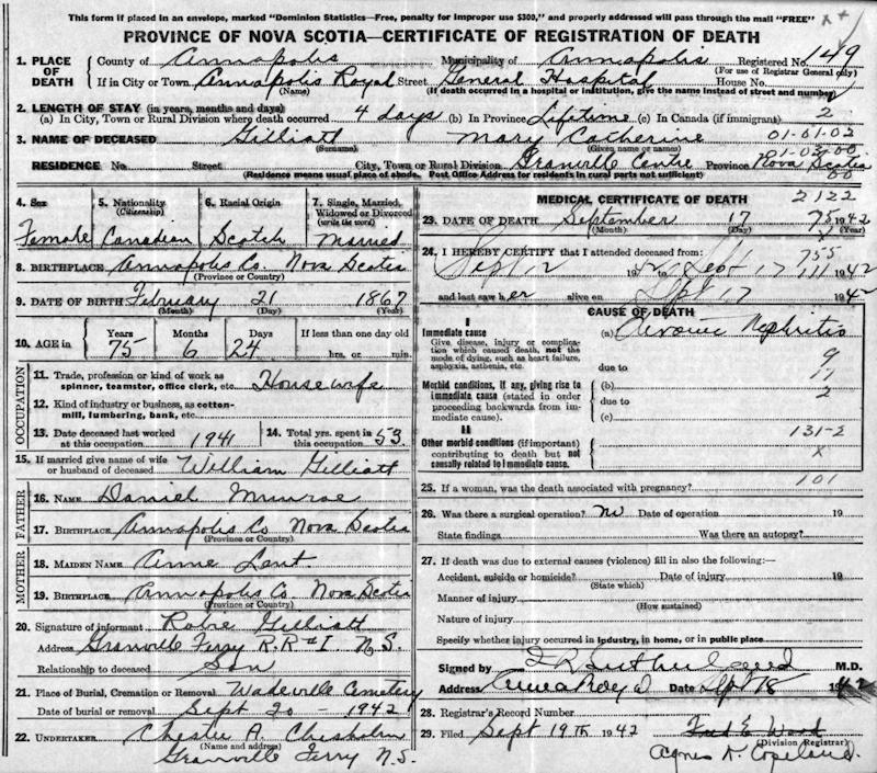 Parents Father: MUNRO, Daniel Mother: LENT, Elizabeth Anne Birth Born on February 21, 1866 in Granville, Annapolis Co., NS Death Died on September 17, 1942 in Annapolis Royal, Annapolis Co., NS Buried in Wadeville Cemetery in Granville Centre, Annapolis Co., NS Marriages GILLIATT, William Allan Married on July 13, 1892 in Paradise, Annapolis Co., NS Children GILLIATT, Robie Cleveland: June 12, 1893 - November 29, 1967 GILLIATT, Carroll Rudolf: April 30, 1899 - December 12, 1979 GILLIATT, Hazel Beryl: November 11, 1899 - January 17, 1975 Notes Death: Nephritis Sources Nova Scotia Deaths: Book 202 Pg. 149 Annapolis Cemetery Records: Granville Centre Wadeville Cemetery #37 Images Mary Munro Birth William Jr & Mary (Munro) Gilliatt Mary (Munro) Gilliatt Death William Gilliatt Jr Marriage
