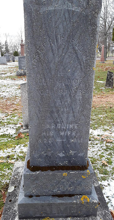 Birth Born on September 03, 1825 in Wilmot, Annapolis Co., NS Death Died on May 05, 1911 in Clarence, Annapolis Co., NS Buried in Pine Grove Cemetery in Middleton, Annapolis Co., NS Marriages PALMER, Joseph F. Married on January 01, 1843 in Wilmot, Annapolis Co., NS Children PALMER, Lena Sophia: January 02, 1866 - May 31, 1960 Notes Death: Old Age Sources Nova Scotia Deaths: Book 1 Pg. 126 #751 Images Joseph & Caroline (Chesley) Palmer