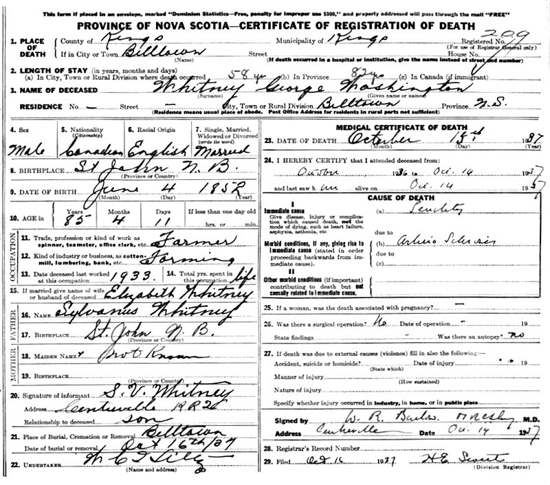 Parents Father: WHITNEY, Sylvanus Mother: PARKER, Elmira Birth Born on June 04, 1852 in Saint John, Saint John Co., NB Death Died on October 15, 1937 in Billtown, Kings Co., NS Buried in Lakeview Billtown Cemetery in Billtown, Kings Co., NS Marriages WHITE, Elizabeth (Roberts) Married on November 09, 1925 in Bridgewater, Lunenburg Co., NS PORTER, Josephine Married on April 29, 1875 in New Minas, Kings Co., NS Children WHITNEY, Thomas Andrew: February 28, 1876 - January 14, 1919 WHITNEY, Sylvanus Victor: March 26, 1878 - December 23, 1940 WHITNEY, Lorne Sutherland: February 18, 1879 - April 03, 1925 WHITNEY, Adelaide Elmira: August 28, 1881 - March 26, 1920 WHITNEY, Josephine Augusta: April 30, 1882 - January 17, 1951 WHITNEY, William Bentley: October 01, 1885 WHITNEY, Alice Maude: February 18, 1887 - August 22, 1958 Notes Occupation: Farmer Death: Senility Sources Nova Scotia Deaths: Book 173 Pg. 209 Images George & Josephine (Porter) & Adelaide Whitney George Whitney Death Josephine Porter Marriage George Whitney Marriage