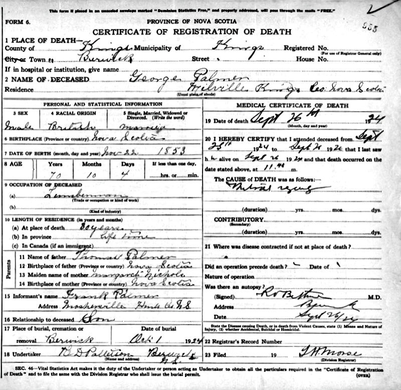 Parents Father: PALMER, Thomas Richard Mother: NICHOLS, Margaret Ann Birth Born on November 22, 1853 in Shubenacadie, Hants Co., NS Death Died on September 26, 1924 in Berwick, Kings Co., NS Buried in Berwick Cemetery in Berwick, Kings Co., NS Marriages PATTERSON, Sophia Lavinia Married on February 01, 1905 in Millville, Kings Co., NS McKINNON, Margaret Married on October 13, 1884 in Lowell, Middlesex Co., MA Children PALMER, Frank Webster: March 20, 1886 - October 09, 1940 PALMER, Ellen Albina: September 30, 1888 - 1981 PALMER, Daniel Gage: July 28, 1890 - June 03, 1976 PALMER, Emma Pearl: January 21, 1892 - August 08, 1971 PALMER, Sadie Katherine: December 21, 1893 - April 12, 1973 PALMER, Elizabeth MacKinnon: March 04, 1897 - August 15, 1945 Notes Occupation: Teamster/ Farmer/ Lumberman Death: Normal Aging Sources Nova Scotia Deaths: Book 93 Pg. 955 Images George Palmer Death George Palmer Marriage