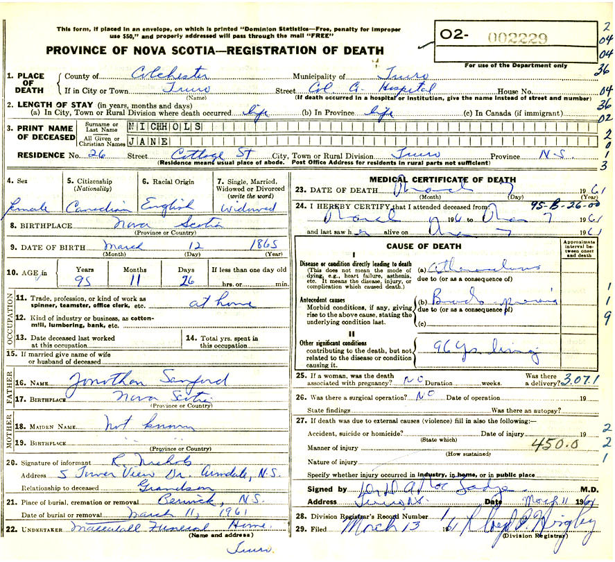 Parents Father: SANFORD, Jonathan Douglas Mother: CHASE, Sarah Jane Birth Born on March 12, 1865 in Weston, Kings Co., NS Death Died on March 07, 1961 in Truro, Colchester Co., NS Buried in Berwick Cemetery in Berwick, Kings Co., NS Marriages NICHOLS, Arthur Mansfield Married on August 17, 1884 in Berwick, Kings Co., NS Children NICHOLS, Arthur Leroy: September 18, 1885 - March 12, 1927 NICHOLS, Agnes Mildred: 1891 - January 05, 1902 Notes Death: Arteriosclerosis/ Broncho Pneumonia Sources Nova Scotia Deaths: Year 1961 Pg. 2229 Images Arthur M. & Jane (Sanford) Nichols Jane (Sanford) Nichols Death Arthur M. Nichols Marriage