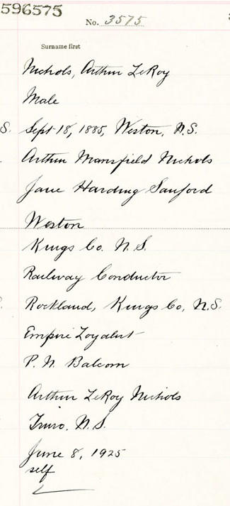 Parents Father: NICHOLS, Arthur Mansfield Mother: SANFORD, Jane Harding Birth Born on September 18, 1885 in Weston, Kings Co., NS Death Died on March 12, 1927 in Jeffersonville, Clark Co., IN Buried in Dayton Memorial Park Cemetery in Dayton, Montgomery Co., OH Marriages POWER, Carrie Etta Married on July 04, 1907 in Berwick, Kings Co., NS Children NICHOLS, George Douglas: April 03, 1908 - November 01, 1969 NICHOLS, Robert Mansfield: February 18, 1912 - January 16, 1986 NICHOLS, Irvine Leroy: September 16, 1916 - May 31, 1980 Notes Occupation: Draftsman Sources Berwick Register: March 30, 1927 Cemetery: Dayton Memorial Park Cemetery Dayton,OH Plot: 5 136 5 Images Arthur L. Nichols Birth Arthur L. & Carrie (Power) Nichols Arthur L. Nichols Marriage