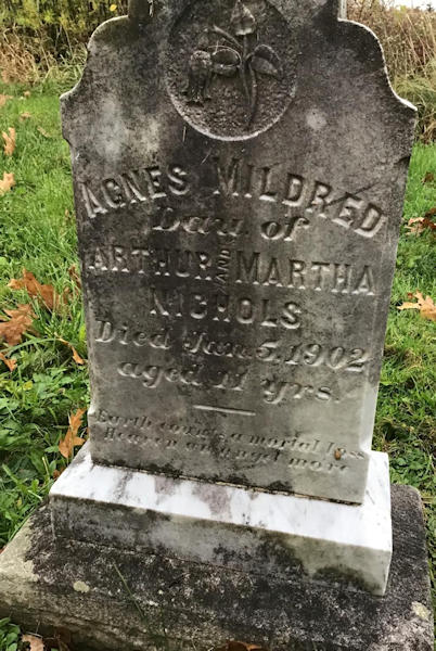Parents Father: NICHOLS, Arthur Mansfield Mother: SANFORD, Jane Harding Birth Born on 1891 in Weston, Kings Co., NS Death Died on January 05, 1902 in Hants Co., NS Buried in Centre Burlington Cemetery in Centre Burlington, Hants Co., NS Sources Hants Cemeteries: Centre Burlington Cemetery Centre Burlington,NS Images Agnes Nichols