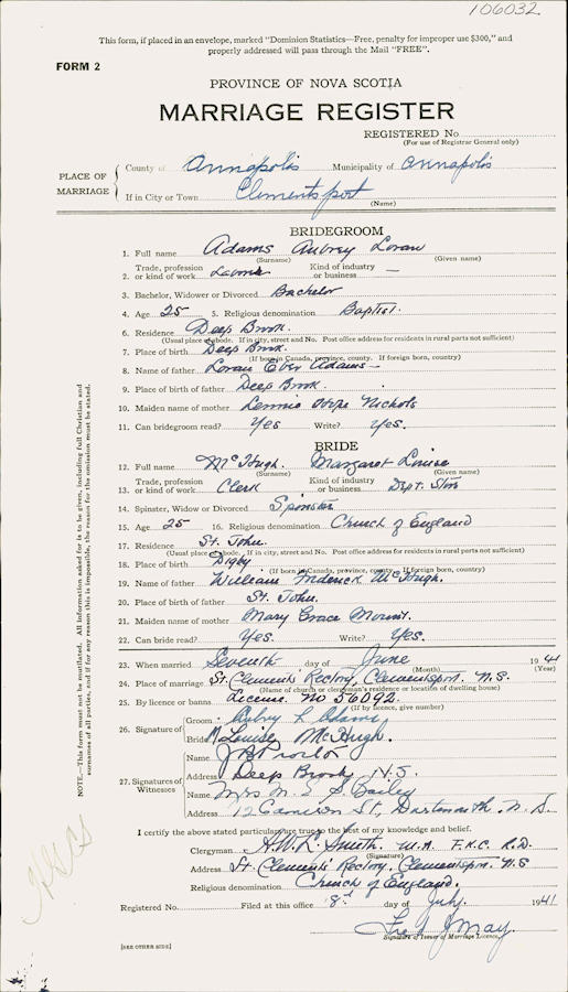 Parents Father: ADAMS, Loran Eber Mother: NICHOLS, Lennie Hope Birth Born on September 22, 1915 in Deep Brook, Annapolis Co., NS Death Died on March 15, 1965 in Conway, Digby Co., NS Buried in Smith-Sulis Cemetery in Smiths Cove, Digby Co., NS Marriages McHUGH, Margaret Louise Married on June 07, 1941 in Clementsport, Annapolis Co., NS Children ADAMS, Wendy Notes Occupation: Automobile Salesman Death: Coronary Thrombosis Sources Nova Scotia Deaths: Year 1965 Pg. 2258 Images Aubrey Adams Birth Aubrey & Margaret (McHugh) Adams Aubrey Adams Death Aubrey Adams Marriage