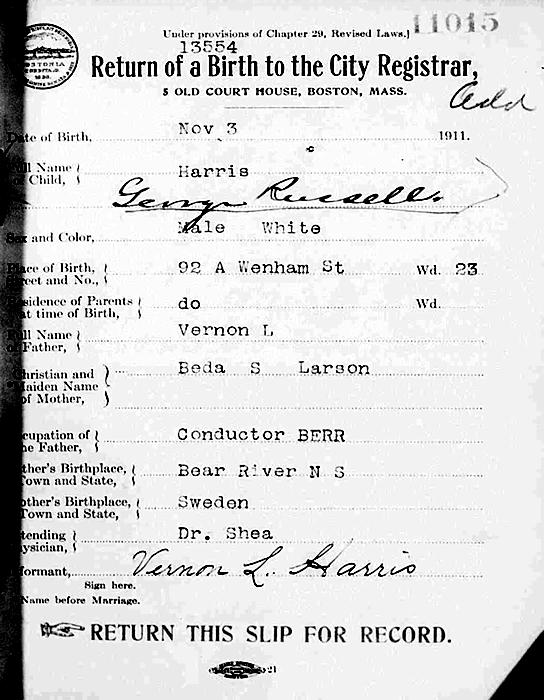 Birth Born on November 03, 1911 in Boston, Suffolk Co., MA Death Died on November 10, 1989 in Rothesay, Kings Co., NB Buried in Clementsvale Cemetery in Clementsvale, Annapolis Co., NS Marriages ADAMS, Freda Pauline Married on May 14, 1933 in Annapolis Royal, Annapolis Co., NS Notes Occupation: Postal Clerk Sources My Heritage: https://www.myheritage.com/profile-OYYV62JXMB55HE6UAGNGDCBDO46INVY-1500155/george-russell-harris# Images George R. Harris Birth George & Freda (Adams) Harris