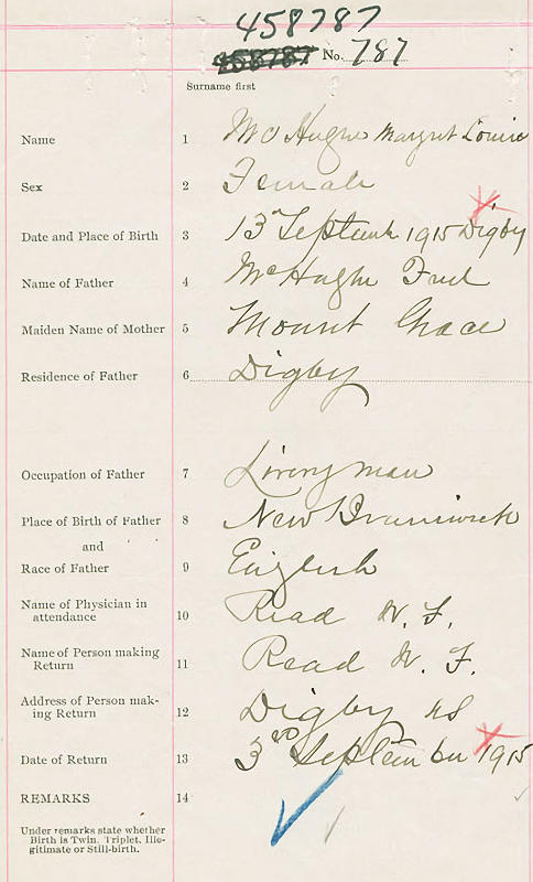 Birth Born on September 13, 1915 in Digby, Digby Co., NS Death Died on March 17, 2011 in Annapolis Royal, Annapolis Co., NS Buried in Smiths Cove, Digby Co., NS Marriages ADAMS, Aubrey Loran Married on June 07, 1941 in Clementsport, Annapolis Co., NS Children ADAMS, Wendy Notes Occupation: Retail Clerk/ Receptionist - Switchboard Operator Digby General Hospital Obituary: It is with great sadness, but loving memories, that the family of Margaret Louise Dunn, known as "Louise" by friends and family, announce her death on March 17, 2011 at the age of 95. Louise had been a resident of the Annapolis Royal Nursing Home since 2008. She died peacefully in her sleep at the nursing home. Louise was born in Digby, the daughter of the late Frederick and Grace McHugh. She lived in Digby, Halifax and Saint John, NB, before settling in Smith's Cove, NS in 1929. As a young woman she worked in a dentist's office and then as a store clerk. She married Aubrey Adams in 1941. Louise was a stay-at-home Mum, devoting herself to her husband and their only child, Wendy. As a member of the parish of Trinity Anglican Church, Digby, and also the Anglican parish of Clements, she was very involved in the life and work of the Anglican Church of Canada, serving as Sunday School teacher, on the Altar Guild, and in any capacity in which she was needed in her parish. She had a deep love of God and her faith was unshakable and firm. She is well known for her tireless work with the Prayer Book Society of Canada and with the Nova Scotia Branch, in particular, playing a large role in the work of that organization as a Director for many years. Louise was an avid reader, bridge player and animal lover. Very special for her were the horses, dogs and cats that were cherished pets over her lifetime. In recent years she had owned Shetland Sheepdogs and loved them dearly. She enjoyed feeding and watching birds and the property around her home was a sanctuary for all of God's creatures. Gardening and enjoying the beauty of her flower beds was also a great interest. In 1965, Louise's beloved first husband, Aubrey, died suddenly. She eventually went to work at the Digby General Hospital as receptionist and switchboard operator. She made many friends in her workplace who will remember her fondly. In 1969 she married Harold Dunn with whom she entered into a most loving bond and companionship for the remainder of her life. She continued her work at the Digby hospital for a number of years and was greatly missed upon her retirement. Louise will be remembered by all friends and family for her selfless and thoughtful giving to others. She was always there for those who needed her kindness or a listening ear. She was generous in every way with her time and energy to help those who were in need. Louise reached out with an inborn sense of Christian charity and was much loved for her caring sensitivity. She loved all of her family with a passion and sincere pride. All will hold dear the many memories of happy family gatherings, big meals and much fun at the Dunn home. Louise was a member of the congregation of St. Edward the Confessor Anglican Church, parish of Clements in Clementsport. She is survived by her husband, Harold Dunn, Annapolis Royal Nursing Home; daughter, Wendy James (Terry), Greenhill, NS; grandsons, Ian James, Bridgewater, NS; Graham James (Joanna), Petawawa, Ontario; and granddaughter, Amanda Garland (Craig), Three Mile Plains, NS. She is also survived by great-granddaughters, Erin James, Petawawa and Emma Garland, Three Mile Plains; and great-grandsons Adam James, Petawawa and Benjamin Garland, Three Mile Plains. Louise also leaves behind her step-son, Ray Dunn (Linda), their children and grandchildren; nephew James Hearn (Susan), Eltham, England; niece, Susan Patstone, St. John, NB; and niece Pamela Landry, Ottawa, Ontario as well as several great-nieces and great-nephews. She was much loved by all and will be deeply missed. Louise was predeceased by her first husband, Aubrey Adams; brother, Barry McHugh; sister, Vara Sulis and sister, Kathleen Hearn. Sources Obituary: Annapolis Royal,NS March 2011 Images Margaret McHugh Birth Aubrey & Margaret (McHugh) Adams Aubrey Adams Marriage Margaret McHugh