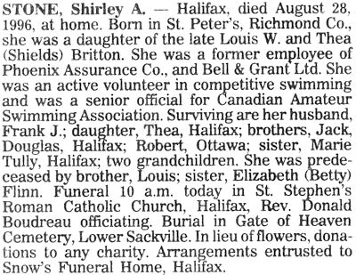 Parents Father: BRITTON, Louis William Mother: SHIELDS, Bethia Mary Birth Born on November 29, 1933 in St. Peters, Richmond Co., NS Death Died on August 28, 1996 in Halifax, Halifax Regional Municipality, NS Buried in Gate of Heaven Cemetery in Lower Sackville, Halifax Co., NS Marriages STONE, Frank Joseph Married on September 06, 1954 Children STONE, Thea Mary: October 31, 1966 Notes Occupation: Insurance Co. Employee Obituary: Stone, Shirley A. - Halifax, died August 28, 1996, at home. Born in St. Peter's, Richmond Co., she was a daughter of the late Louis W. and Thea (Shields) Britton. She was a former employee of Phoenix Assurance co., and Bell & Grant Ltd. She was an active volunteer in competitive swimming and was a senior official for Canadian Amateur Swimming Association. Surviving are her husband, Frank J.; daughter, Thea, Halifax; brothers, Jack, Douglas, Halifax; Robert, Ottawa; sister, Marie Tully, Halifax; two grandchildren. She was predeceased by brother, Louis; sister, Elizabeth (Betty) Flinn. Funeral 10 a.m. today in St. Stephen's Roman Catholic Church, Halifax, Rev. Donald Boudreau officiating. Burial in Gate of Heaven Cemetery, Lower Sackville. In lieu of flowers, donations to any charity. Arrangements entrusted to Snow's Funeral Home, Halifax. Sources Halifax Herald: Obituary August 1996 Images Shirley (Britton) Stone Shirley Britton Shirley (Britton) Stone Obit