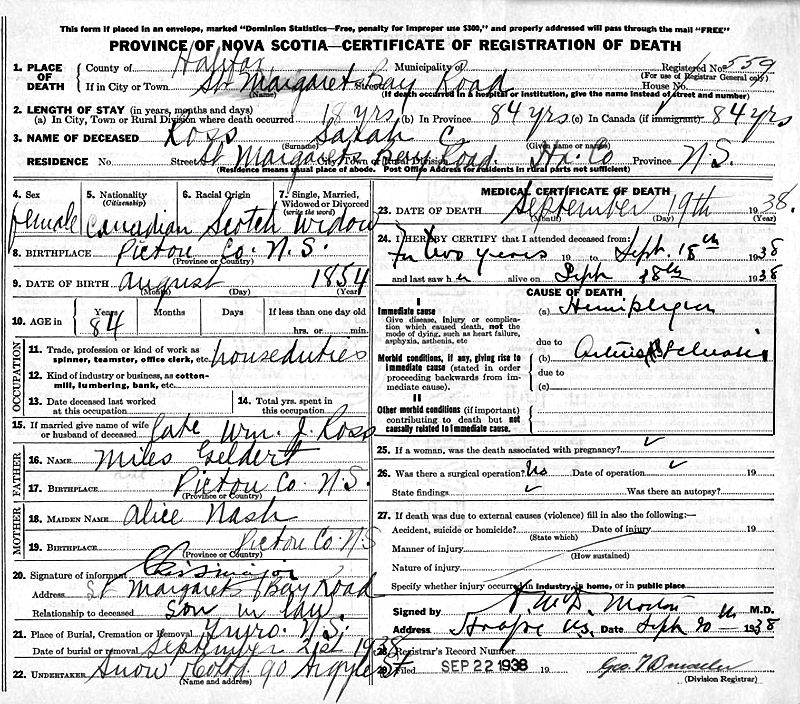 Parents Father: GELDERT, Miles Cooper Mother: NASH, Alice Burnyeat Birth Born on August 26, 1854 in Pictou, Pictou Co., NS Death Died on September 19, 1938 in St. Margaret's Bay Rd., Halifax Co., NS Buried in Terrace Hill Cemetery in Truro, Colchester Co., NS Marriages ROSS, William John Married on August 16, 1882 in Pictou, Pictou Co., NS Children ROSS, Caroline L.: 1883 - November 09, 1890 ROSS, William: 1885 - April 14, 1890 ROSS, David: 1887 - May 24, 1888 ROSS, Alberta Kaulback: January 10, 1890 - July 31, 1972 ROSS, Alice Nash Bennetta: March 22, 1892 - August 11, 1966 Notes Death: Hemiplegia Sources Nova Scotia Deaths: Book 171 Pg. 559 Colchester Cemeteries: Truro Terrace Hill Cemetery L15 Images Saeah (Geldert) Ross Death Sarah (Geldert) Ross Death William J. Ross Marriage2