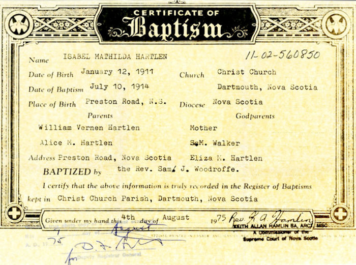 Parents Father: HARTLEN, William Verner Mother: BAINBRIDGE, Alice Margaret Birth Born on January 11, 1911 in Preston Road, Halifax Co., NS Death Died on October 16, 1993 in Halifax, Halifax Regional Municipality, NS Buried in United Church Cemetery in Milford, Hants Co., NS Marriages WOODWORTH, James Edwin Married on September 23, 1939 in Stewiacke, Colchester Co., NS Children WOODWORTH, Calvin: 1950 WOODWORTH, Shirley Isabel: March 09, 1940 WOODWORTH, Marion Elsie: May 16, 1942 WOODWORTH, Donald William: January 06, 1945 - January 21, 1966 WOODWORTH, James Ross: July 24, 1951 - January 05, 1952 WOODWORTH, Nola Evelyn: November 21, 1953 Sources Halifax Herald: Obituary October 1993 Images Isabel Hartlen Baptism Isabel Hartlen Birth James E. Woodworth Marriage Isabel (Hartlen) Woodworth Obit