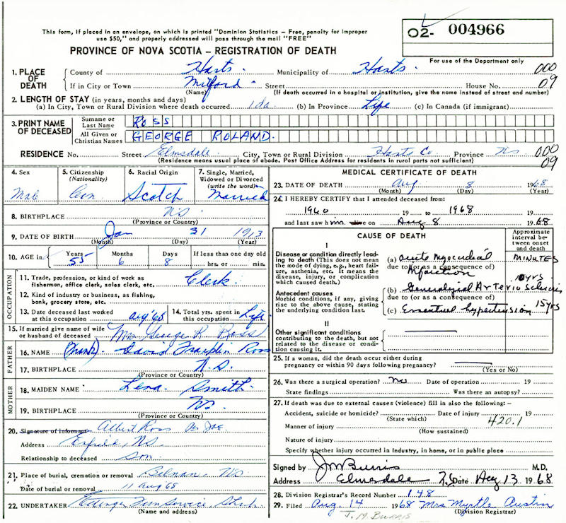 Parents Father: ROSS, David Franklin Mother: SMITH, Lena May Birth Born on January 31, 1913 in Carroll's Corner, Halifax Co., NS Death Died on August 08, 1968 in Milford, Hants Co., NS Buried in Sandy Hill Cemetery in Belnan, Hants Co., NS Marriages WELLWOOD, Enna Matilda Married on September 28, 1935 Children ROSS, Albert David: July 27, 1937 ROSS, Judith Ann: June 26, 1944 Notes Occupation: Clerk Death: Acute Myocardial Infarction Sources Nova Scotia Deaths: Year 1968 #4966 Images George R. Ross Birth George R. & Enna (Wellwood) Ross George R. Ross Death George R. Ross Marriage