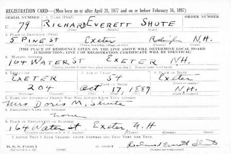 Parents Father: SHUTE, Henry Augustus Mother: WEEKS, Amelia Frances Birth Born on October 17, 1887 in Exeter, Rockingham Co., NH Death Died on October 01, 1957 in Exeter, Rockingham Co., NH Buried in Exeter Cemetery in Exeter, Rockingham Co., NH Marriages MACKENZIE, Doris Elizabeth Married on June 24, 1922 in Exeter, Rockingham Co., NH Children SHUTE, Henry Woodworth: February 25, 1924 - June 09, 1988 SHUTE, Muriel MacKenzie: January 10, 1931 - January 11, 1931 SHUTE, Richard MacKenzie: May 31, 1936 - January 10, 2009 Notes Occupation: Lawyer/ Judge Election: New Hampshire Legislature 1917-1919 Death: Carcinoma of Lung Sources New Hampshire Deaths: #57-5327 Images Richard E. Shute Birth Richard Shute Richard Shute Death Richard Shute WW1 Draft Richard Shute WW2 Draft Doris MacKenzie Marriage Richard E. Shute Marriage