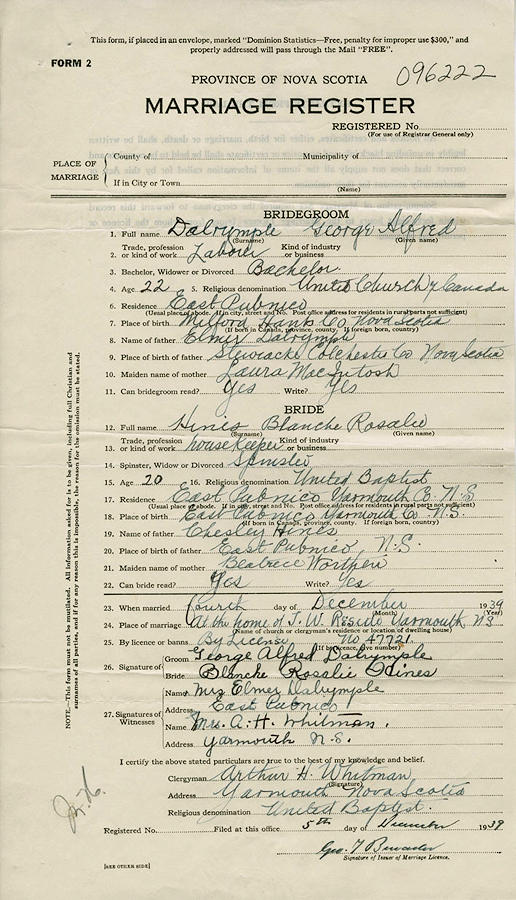 Parents Father: DALRYMPLE, Elmer Stuart Mother: McINTOSH, Laura May Birth Born on October 26, 1916 in Milford Station, Hants Co., NS Death Died on July 24, 1993 in Halifax, Halifax Regional Municipality, NS Buried in Admiral Rock United Church Cemetery in Admiral Rock, Hants Co., NS Marriages HINES, Blanche Rosalie Married on December 04, 1939 in Yarmouth, Yarmouth Co., NS Children DALRYMPLE, Richard DALRYMPLE, Lawrence Alfred: December 26, 1941 DALRYMPLE, Donald: 1944 DALRYMPLE, Marion: 1946 DALRYMPLE, Linda: 1947 DALRYMPLE, Ann: 1954 Notes Obituary: DALRYMPLE, George Alfred - 77, Admiral Rock, Hants County, died July 24, 1993, in the Halifax Infirmary Palliative Care Unit. Born in Milford, Hants County, he was a son of Laura (MacIntosh) Dalrymple, Admiral Rock, and the late Elmer Dalrymple. He had been a resident of Admiral Rock for the past 20 years, previously a resident of Windsor Junction. He was a retired checker with the CNR and a member and active worker at Admiral Rock United Church. He is survived by his wife, the former Blanche Hines; three sons, Laurie, Sutton, Ont.; Donald, Kinsac, Halifax County; Richard, Admiral Rock; three daughters, Marion Fazio, Stewiacke; Linda Vaughan, Anne Weir, both of Admiral Rock; two brothers, Harry, Sarnia, Ont.; James (Sam), Dutch Settlement; three sisters, Frances Lind, Dartmouth; Jean Osmond, Bedford; Betty Vaughan, Lake Fletcher; 16 grandchildren; 11 great-grandchildren. He was predeceased by three brothers, Ralph (Mike), Clarence (Kay), Douglas; sister, Dorothy (Dot). Visitation will be 24, 7-9 p.m. today in Ettinger Funeral Home, Shubenacadie and 11 a.m.-4 p.m. Tuesday in Admiral Rock United Church, where funeral will be 4 p.m. Tuesday, Rev. Chris Ryan officiating. Burial will be in Admiral Rock Cemetery. Donations may be made to Admiral Rock Cemetery Fund. Halifax Herald Halifax,NS July 26,1993 Occupation: CNR Checker Sources Halifax Herald: Obituary July 26,1993 Images George A. Dalrymple Birth George Dalrymple Birth George & Blanche (Hines) Dalrymple George A. Dalrymple Marriage George Dalrymple Marriage George A. Dalrymple