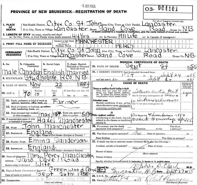 Birth Born on November 22, 1884 in Studholme, Kings Co., NB Death Died on September 24, 1955 in Lancaster, Saint John Co., NB Buried in Greenwood Cemetery in Saint John, Saint John Co., NB Marriages MORRISON, Hazel Married on November 12, 1912 in Pictou, Pictou Co., NS Children MANCHESTER, John Stewart: May 22, 1916 - March 08, 1994 Notes Occupation: Farmer Death: Arteriosclerotic Heart Disease Sources NB Deaths: #4101 Images Percival & Hazel (Morrison) Manchester Percy Manchester Death Percival Manchester Marriage