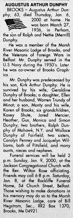 Birth Born on March 27, 1936 in Perham, Aroostook Co., ME Death Died on January 06, 2000 in Brooks, Waldo Co., ME Buried in Mount Prospect Cemetery in Stockton Springs, Waldo Co., ME Marriages FRASER, Geraldine Marie Married on March 01, 1961 in Maine, USA Children DUNPHY, Ellen Marie: November 12, 1960 DUNPHY, Kirk Arthur: March 11, 1964 - May 27, 1973 DUNPHY, Monty Allen: May 01, 1965 Notes Military Service: US Navy Occupation: Co-Owner Brooks Graphics Sources Newspaper Obituary: Bangor Daily News Bangor,ME Jan 7,2000 Images Augustus Dunphy Augustus Dunphy Obit Bangor Daily News Bangor,ME Jan 7,2000