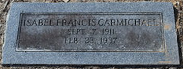 Parents Father: FRANCIS, Edward Mother: MANNING, Nancy Ann Birth Born on September 07, 1911 in Prairie Lea, Caldwell Co., TX Death Died on February 23, 1937 in Prairie Lea, Caldwell Co., TX Buried in Prairie Lea Cemetery in Prairie Lea, Caldwell Co., TX Marriages CARMICHAEL, J. C. Married on December 23, 1936 in San Marcos, Hays Co., TX Notes Occupation: Teacher Death: Bronchial Pneumonia Sources Texas Deaths: #6889 Images Isabel (Francis) Carmichael Isabel (Francis) Carmichael Death Isabel Francis Marriage