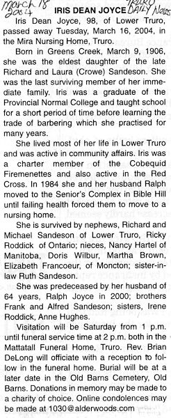 Parents Father: SANDESON, Richard Alexander Mother: CROWE, Laura Beatrice Birth Born on March 09, 1906 in Greens Creek, Colchester Co., NS Death Died on March 16, 2004 in Truro, Colchester Co., NS Buried in Old Barns Cemetery in Old Barns, Colchester Co., NS Marriages JOYCE, Ralph Harris Married on July 27, 1935 in Truro, Colchester Co., NS Notes Occupation: Hairdresser Sources Truro Daily News: Obituary March 18,2004 Pg. A5 Images Iris Sandeson Birth Ralph Joyce Marriage Iris (Sandeson) Joyce Obit