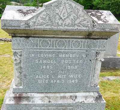 Parents Father: POTTER, John Mother: BALCOMB, Mary Birth Born on December 08, 1835 in Clementsport, Annapolis Co., NS Death Died on October 26, 1909 in Clementsport, Annapolis Co., NS Buried in United Church of Canada Graveyard in Clementsport, Annapolis Co., NS Marriages POTTER, Alice Loretta (Woodbury) Married on 1879 in Annapolis Co., NS Notes Occupation: Merchant Death: Cerebral anemia/ Chronic Gastritis Sources Nova Scotia Deaths: Book 1 Pg. 45 #267 Images Samuel Potter & Alice (Potter) Margeson Samuel Potter Death Samuel Potter Marriage