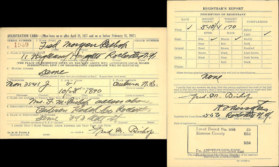 Parents Father: BISHOP, James Spurgeon Mother: MARGESON, Susan Arabella Birth Born on October 28, 1890 in Auburn, Kings Co., NS Death Died on February 03, 1979 in Baltimore, MD Marriages COMMON, Elizabeth Grace Married on June 21, 1920 in Lowell, Middlesex Co., MA Children BISHOP, Anne: September 07, 1922 - September 16, 2017 BISHOP, Cecily: December 22, 1924 - January 20, 2018 Notes Occupation: Research in Optics American Optical Co./ Physicist Eastman-Kodak Co. Sources Mormons: https://www.familysearch.org/en/tree/person/details/L8YT-1KG Images Fred Bishop WW1 Draft Fred Bishop WW2 Draft Fred Bishop Marriage Fred Bishop